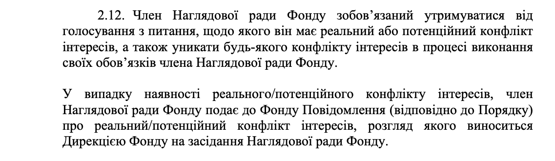 Тобто під час вирішення питання про допуск до експертного оцінювання проєкту, поданого одним із членів Наглядової ради, на обговорення було поставлено питання зміни порядку дій у разі наявності конфлікту інтересів. З огляду на результати голосування, відповідний член Наглядової ради також голосував за допущення свого ж проєкту до експертного дослідження.