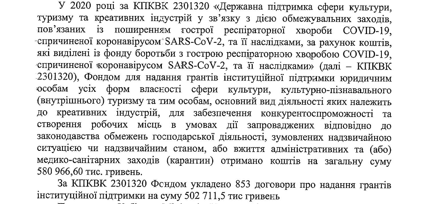 Згідно зі звітом Рахункової палати, цілі державної політики, мета і завдання бюджетної програми, напрями й обсяги використання бюджетних коштів не відповідають напрямам спрямування та цільовому призначенню коштів Фонду, оскільки вони «не пов’язані із здійсненням заходів, спрямованих на запобігання виникненню та поширенню, локалізацію та ліквідацію спалахів, епідемій та пандемій гострої респіраторної хвороби COVID-19, спричиненої коронавірусом SARS-CoV-2, та на боротьбу з її наслідками, і по суті ідентифікуються як фінансова підтримка сфери культури, туризму та креативних індустрій».