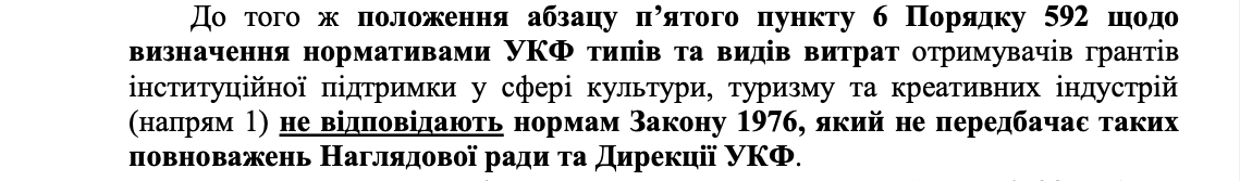 УКФ надав обґрунтоване заперечення до акта Державної аудиторської служби України, зокрема висловивши незгоду з висновками щодо нібито порушень, повʼязаних із виділенням коштів на підтримку у сфері культури відповідно до КВЕД – так званих «основних видів діяльності». Фонд справедливо зазначив, що чинне законодавство не містить визначення або затвердженого переліку «основних видів діяльності», а отже, аналіз фактичної діяльності апліканта в поєднанні з наявністю відповідного КВЕД у сфері культури є достатньою та обґрунтованою підставою для надання фінансової підтримки.