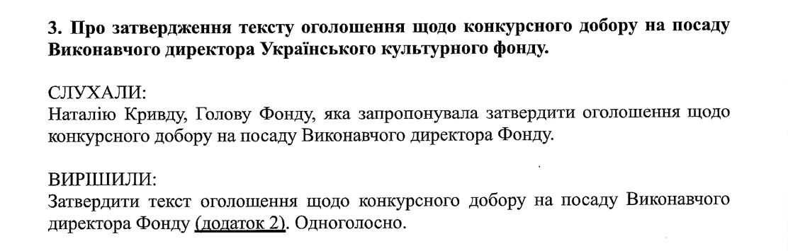 - «2. Про розгляд документів претендентів на посаду Виконавчого директора Українського культурного фонду.