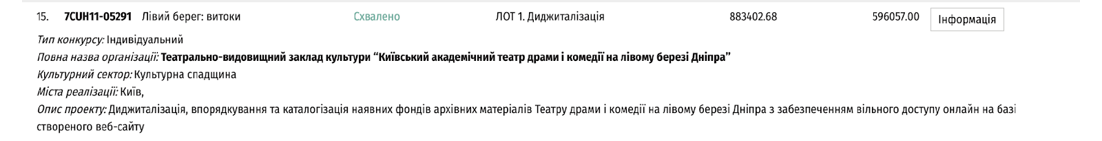 Надалі проєкт № 7CUH11-05291 («Лівий берег: витоки»), поданий на конкурс Театрально-видовищним закладом культури «Київський академічний театр драми і комедії на лівому березі Дніпра», було схвалено; загальний бюджет проєкту – 883 402,68 грн, запитувана сума від Фонду – 596 057 грн.