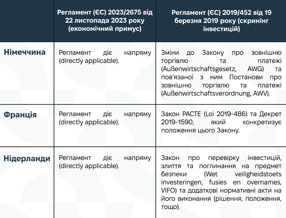Окремі країни-члени ЄС демонструють гнучкі й водночас рішучі підходи. Німеччина активно використовує законодавчі інструменти у сферах енергетичної безпеки, інвестиційного контролю та зовнішньої торгівлі. Франція - через детальну перевірку угод у стратегічних секторах та блокування ризикових інвестицій. Нідерланди ще під час Другої світової війни заклали засади системної протидії ворожому економічному впливу, що згодом трансформувались у сучасну санкційну політику.
