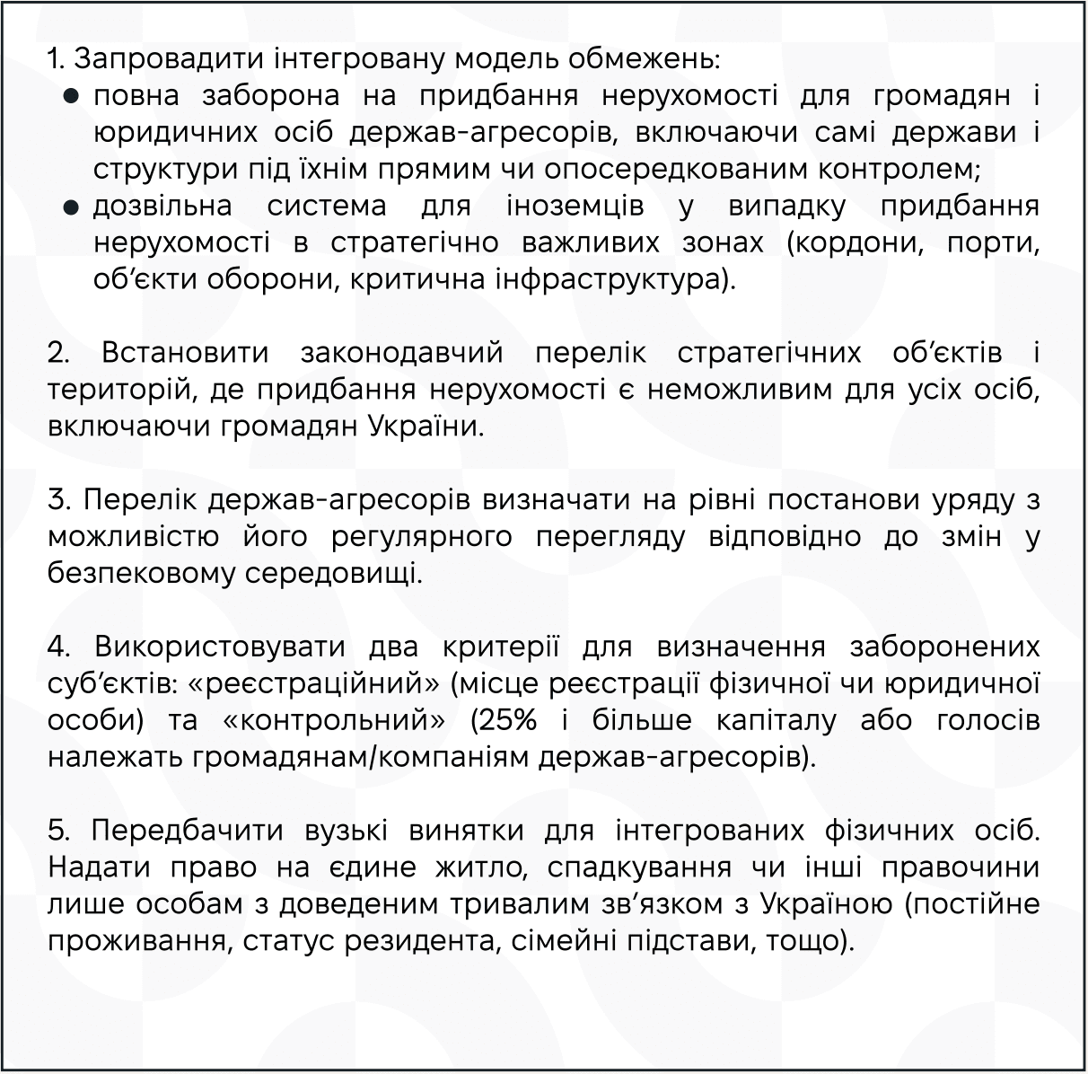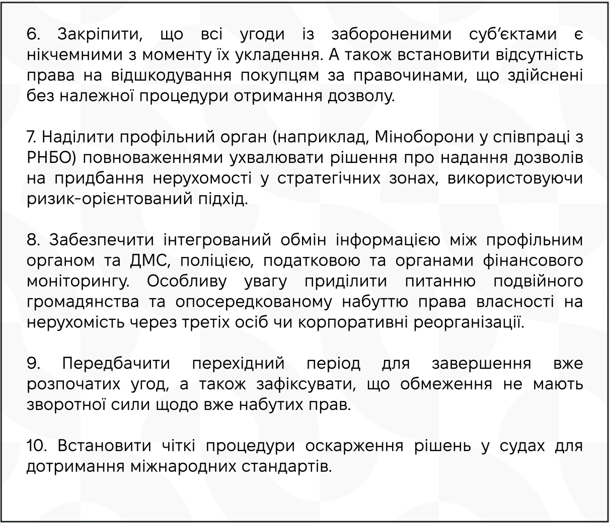 Гібридний вплив у сфері нерухомості проявляється не у відкритій конфронтації, а через «повзуче» накопичення активів і контроль над стратегічно важливими ділянками: біля об’єктів оборони, ключової інфраструктури, на кордонах та в портових зонах. Власність може слугувати прикриттям для доступу до інформації, каналом впливу на муніципальні рішення, логістичним майданчиком або важелем економічного та політичного тиску. Через це виникає потреба у встановленні режимів, які водночас блокують небажану присутність і зберігають правову визначеність для добросовісних учасників ринку.