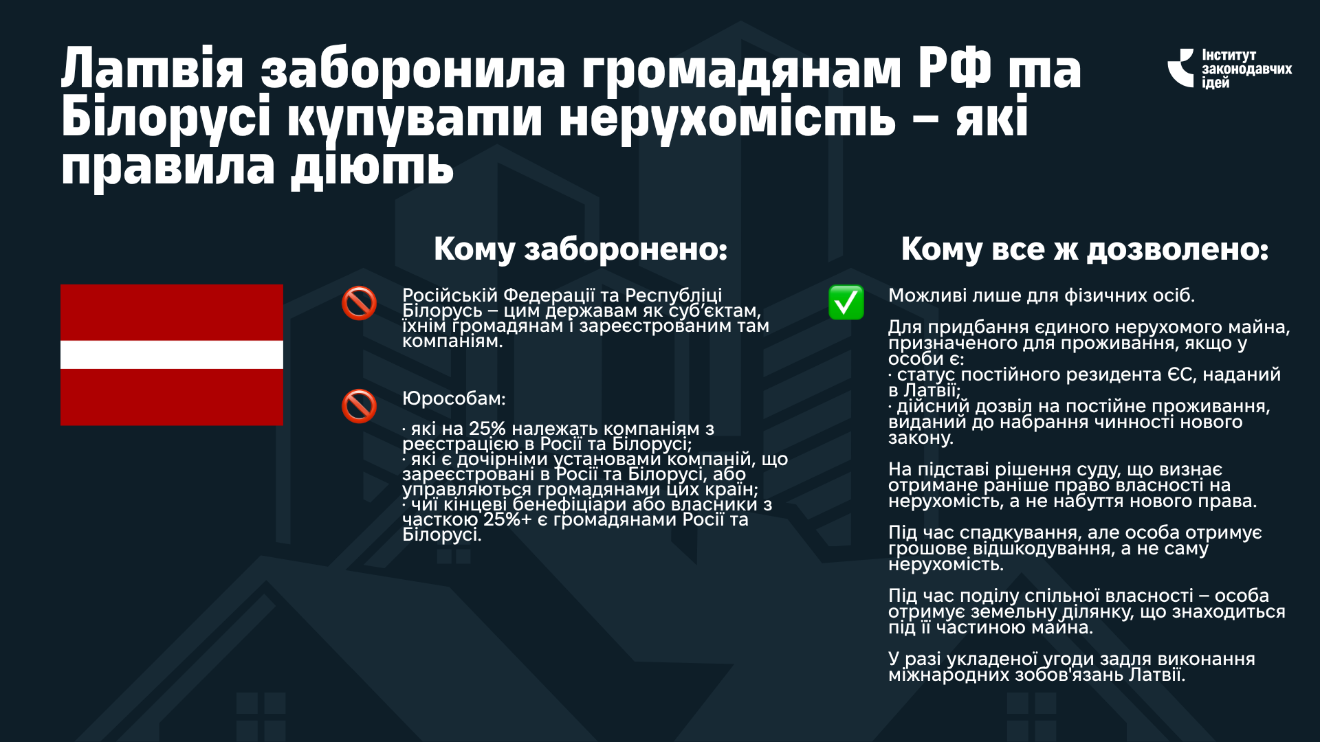 Ключ до розуміння латвійського підходу полягає у визначенні кола заборонених суб’єктів. Заборона набуття нерухомості поширена не лише на держав-агресорів та їхніх громадян, а й на юридичних осіб, зареєстрованих у цих державах, і на структури, де громадяни держав-агресорів або підконтрольні їм компанії мають суттєву участь. Якщо 25% і більше капіталу або голосів належить таким особам, або кінцевими бенефіціарами прямо чи опосередковано є громадяни цих країн, то заборона зберігається.