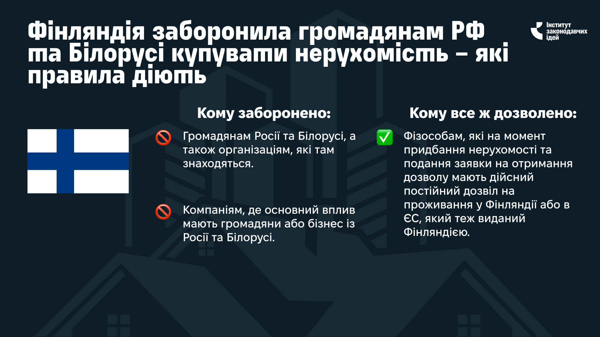 На тлі загроз і викликів, у липні 2025 року Фінляндія запровадила низку змін до закону, щоб посилити контроль за придбанням нерухомості іноземними особами. Був обраний інструмент "жорсткого фільтра" в межах системи дозволів. Ключова новація – "безумовні перешкоди" для надання дозволу. Вони стосуються осіб і організацій, громадянство або контроль яких пов’язані з державами, що становлять загрозу національній безпеці та порушили територіальну цілісність іншої країни.