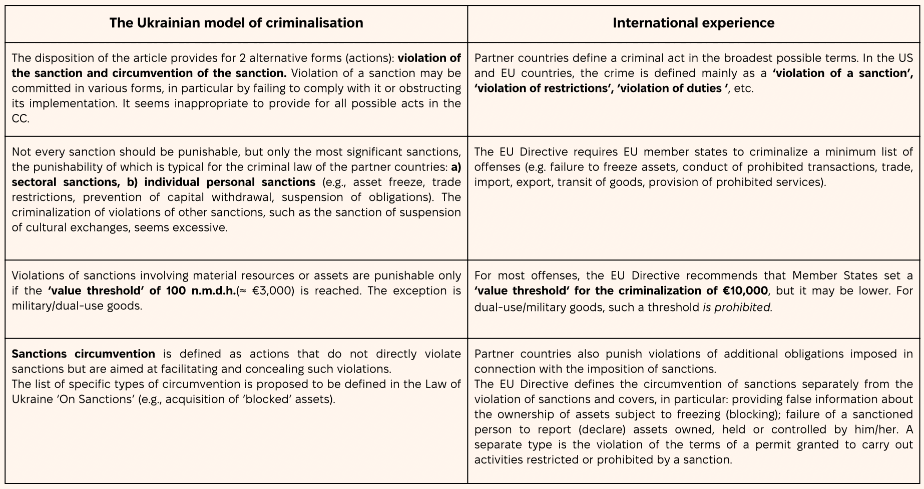 That is why, when developing the Ukrainian model of criminalisation of sanctions violations, the Working Group consisting of the NGO ‘Institute of Legislative Ideas’, the Ministry of Justice of Ukraine, the Office of the President of Ukraine, the SSU, the PGO, the Ministry of Internal Affairs, the Ministry of Economy, the NACP, the NBU, the NSSMC was guided by the best international practices and EU approaches, which Ukraine, due to its European integration processes, should implement in its legislation.